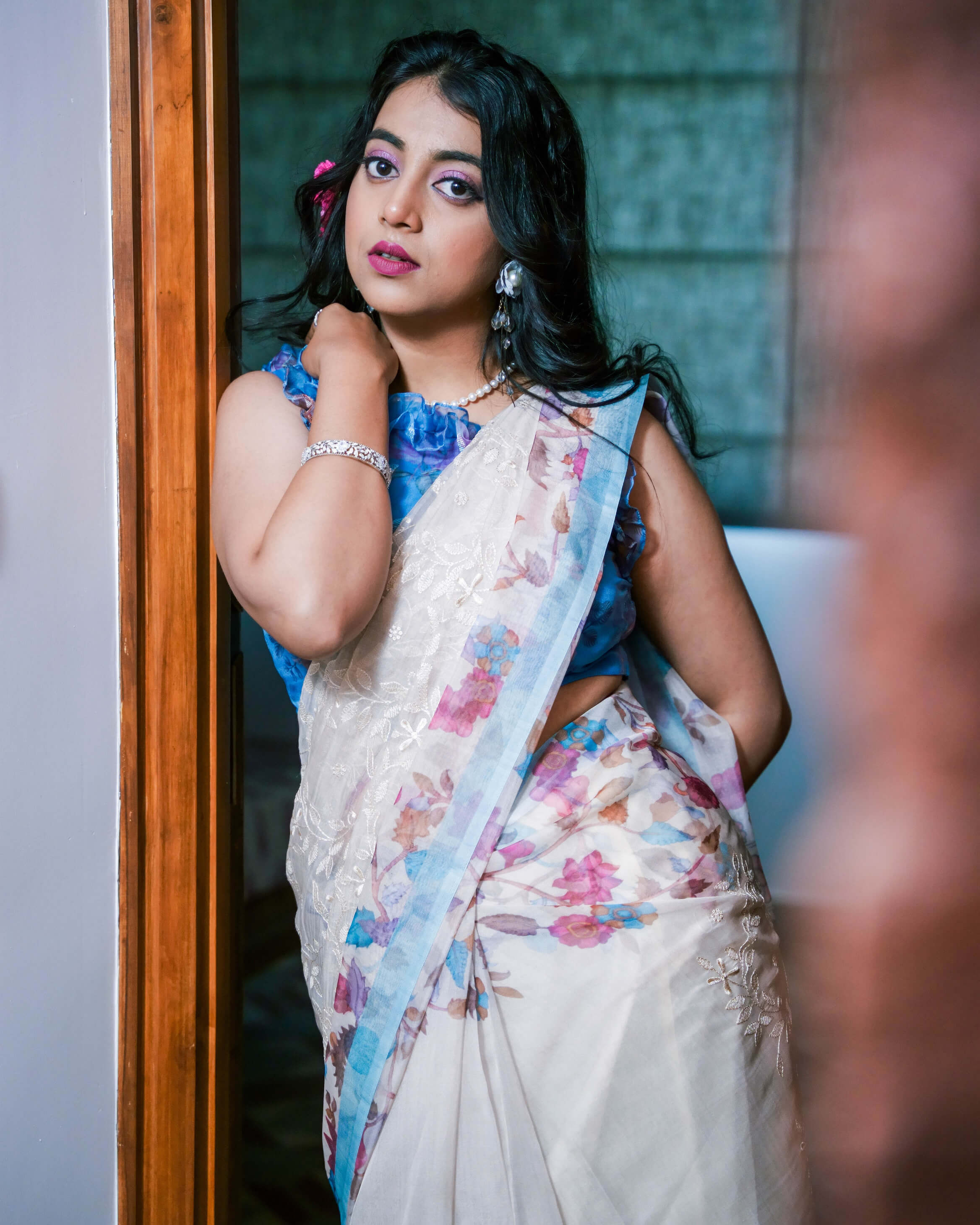Off-White Linen Organza Saree with Embroidery by Isha Silks